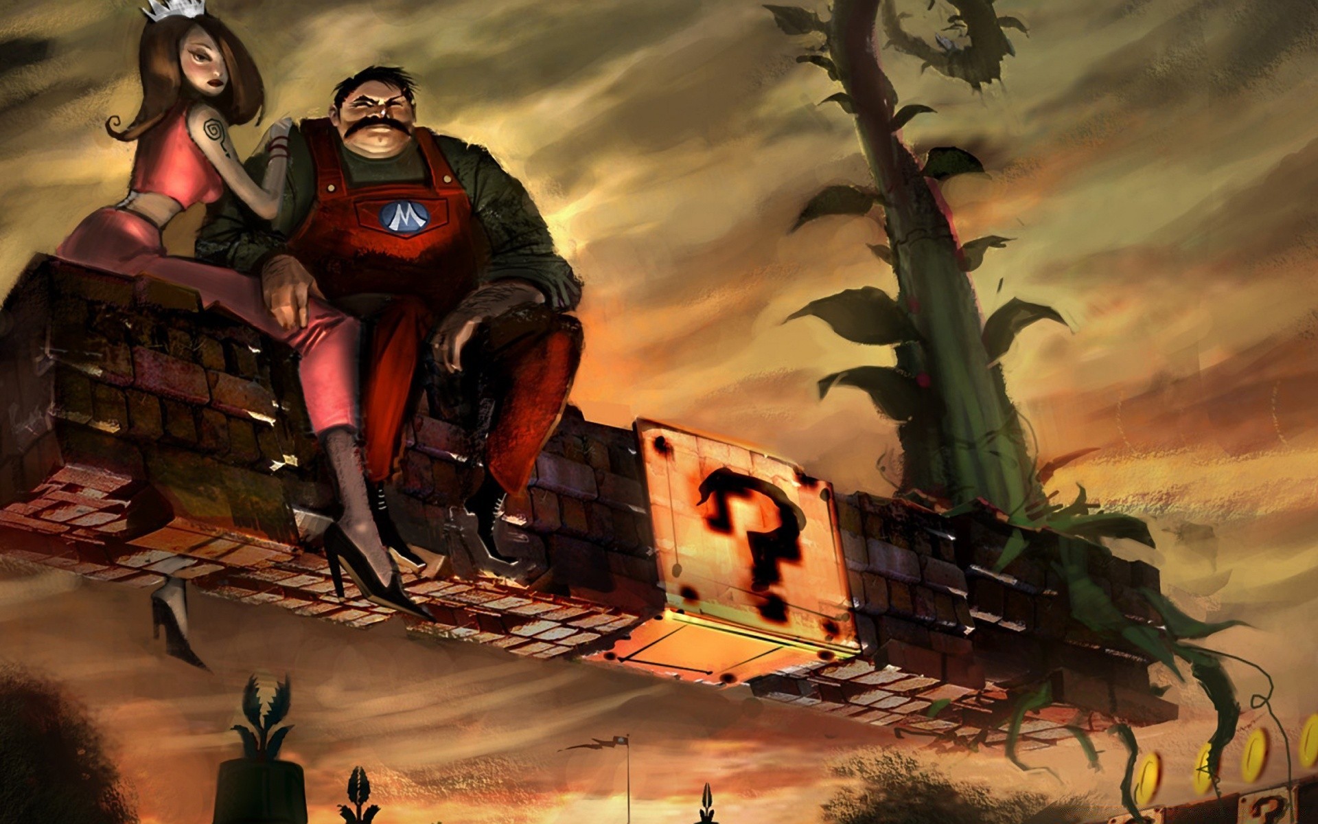 The heroes of the game mario look at the sunset