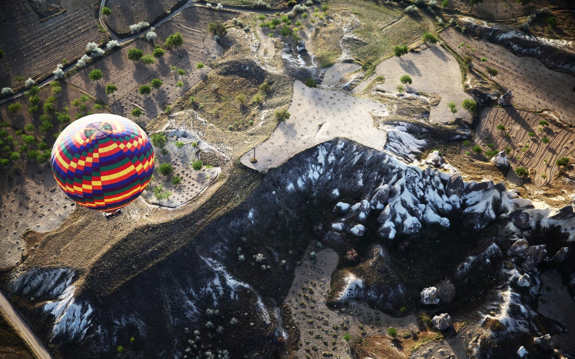 Sky, balloons, mountains, fields