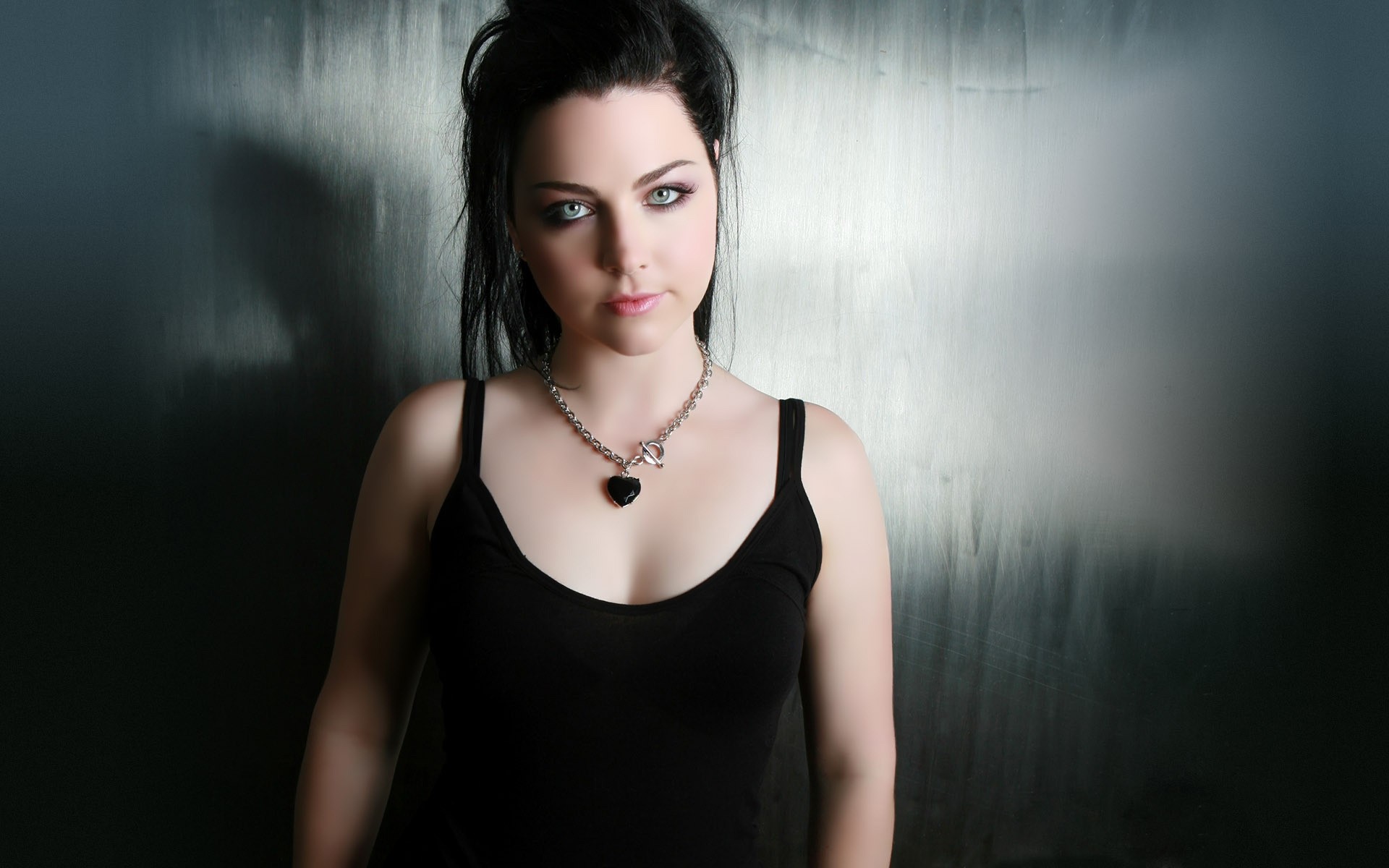 A girl in a black room in a leather black short dress is sitting on the floor
