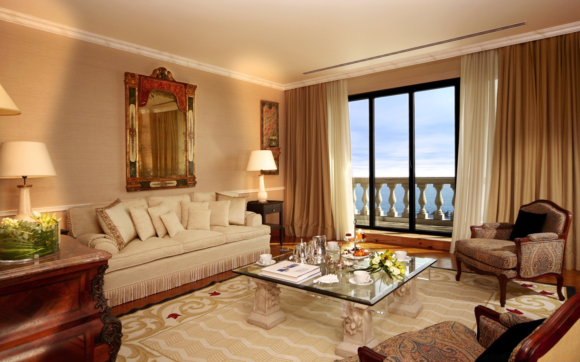 A white sofa and a night light on a table against a background of brown tiles and a glossy floor