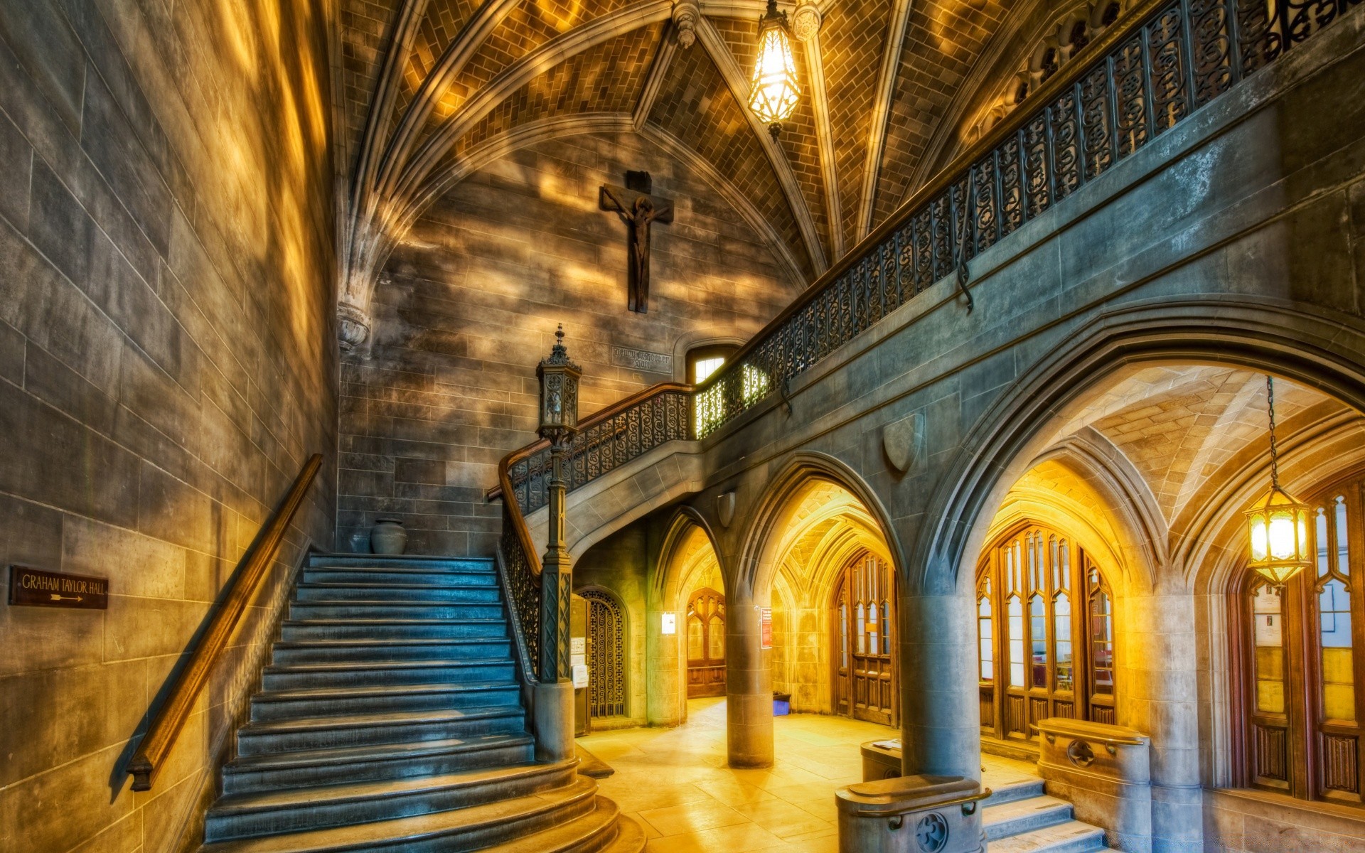 Stone staircases in the amazing architecture of the house under the ceiling of which there is a crucifix
