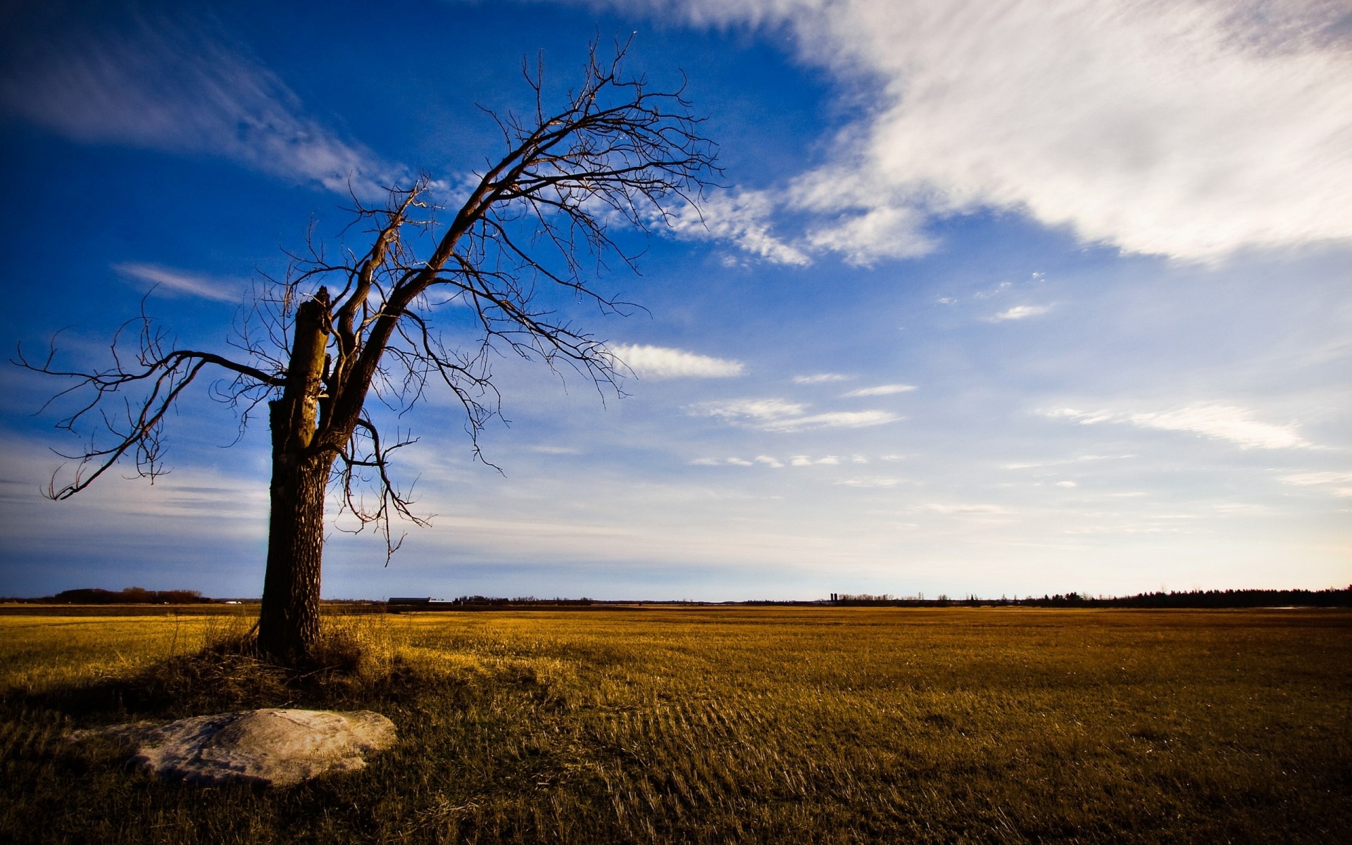 Landscape. Blue sky. Clouds in the sky. Green tree. Green grass
