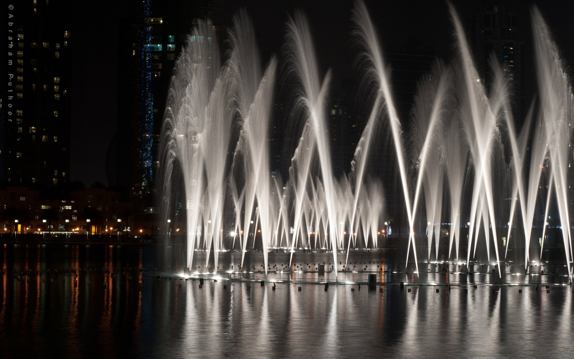 A monument in the form of the tail of a silver fish sticks out of the river against the background of the setting Moon and the night city