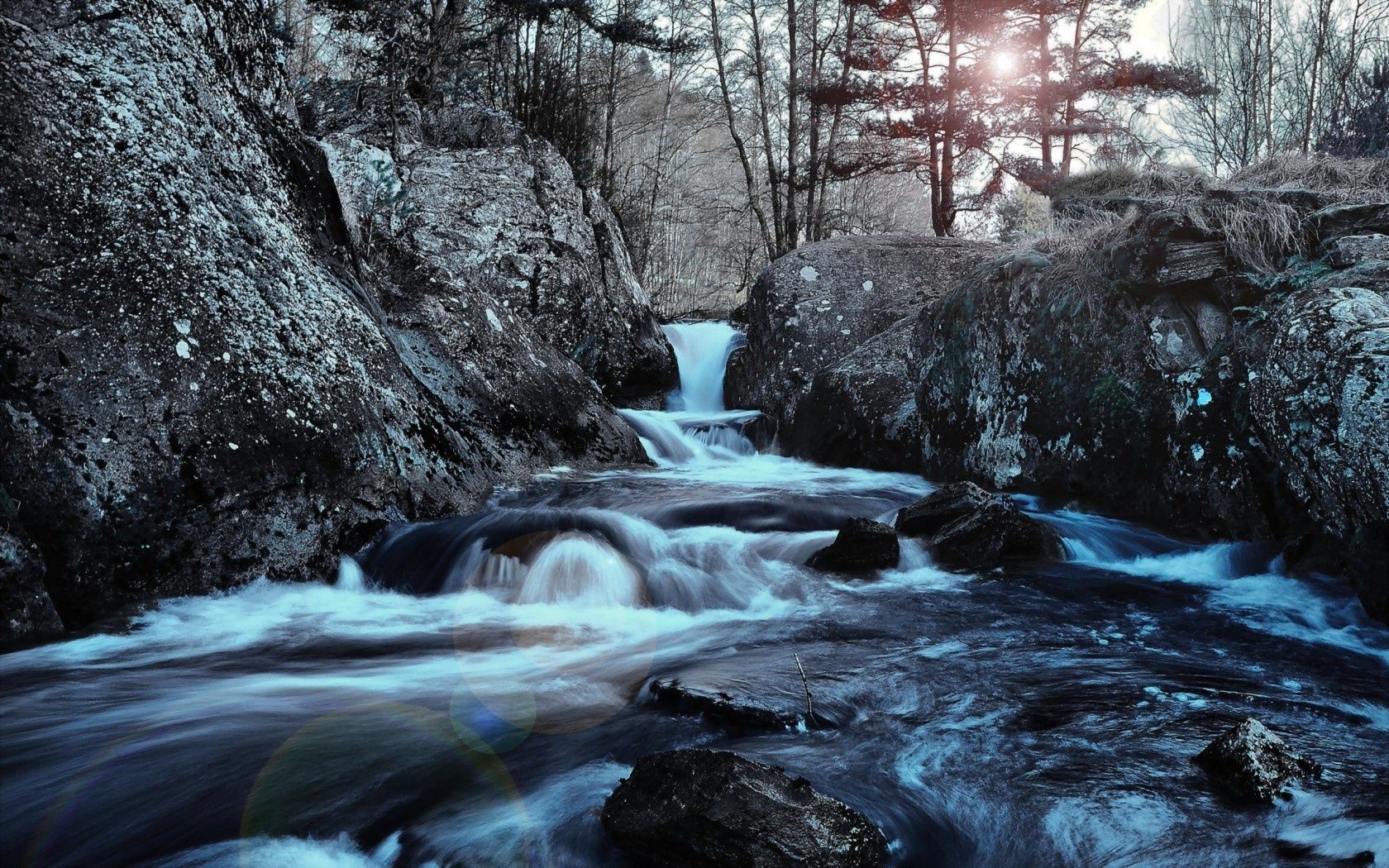 A small house with a snow-covered roof at the foot of the mountain and a blue sky with white clouds