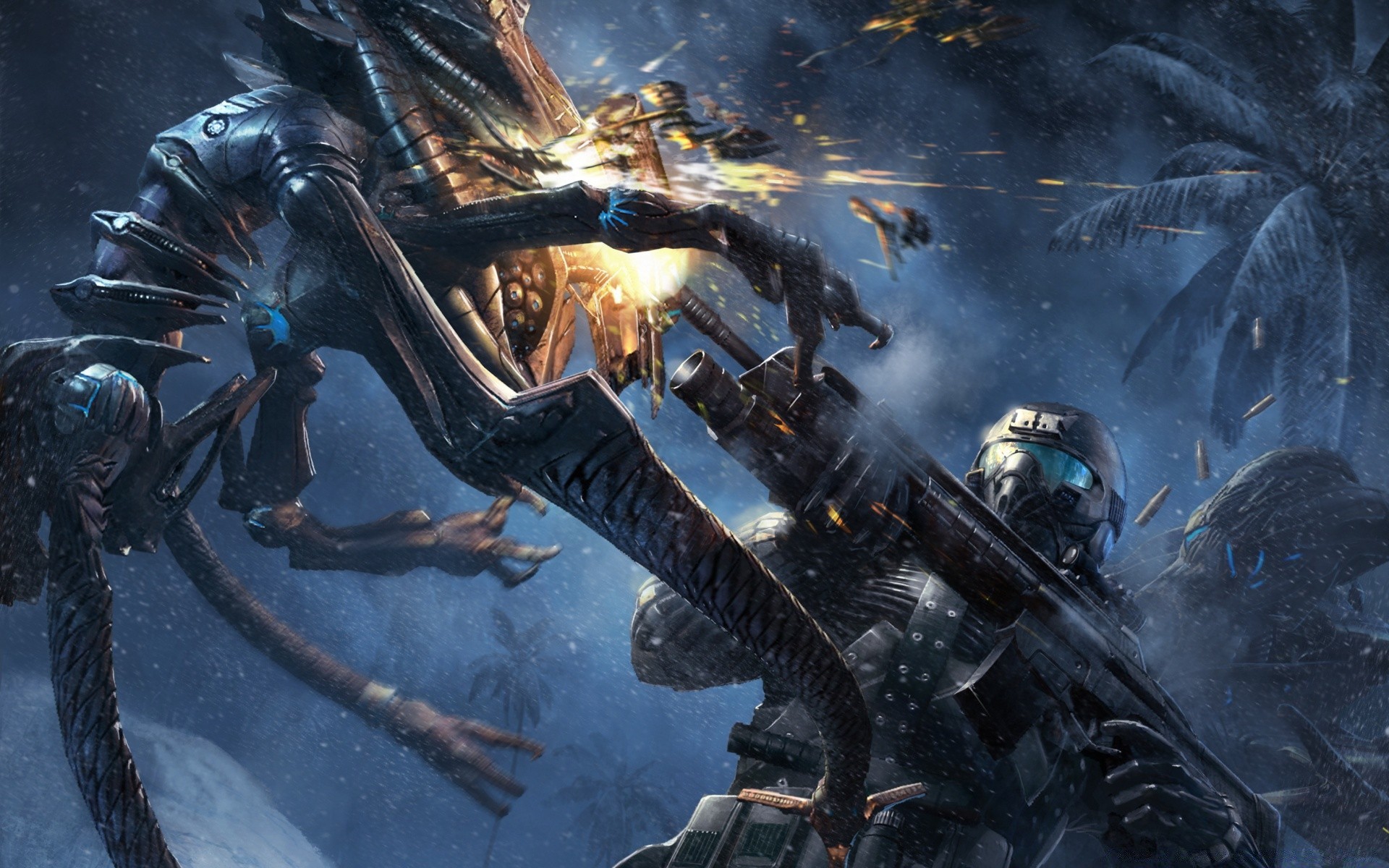 The hero of the game Farcry 4 in full combat gear leaves on the way to his jeep against the background of the sunset sky