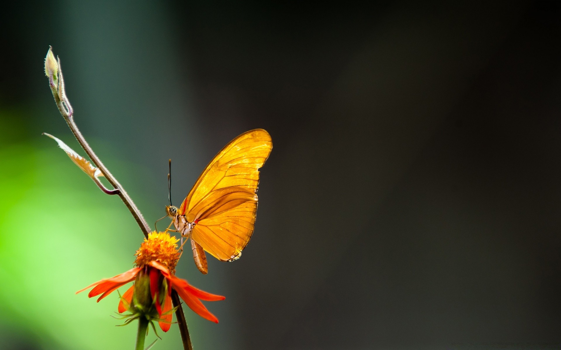A butterfly sits on an orange flower