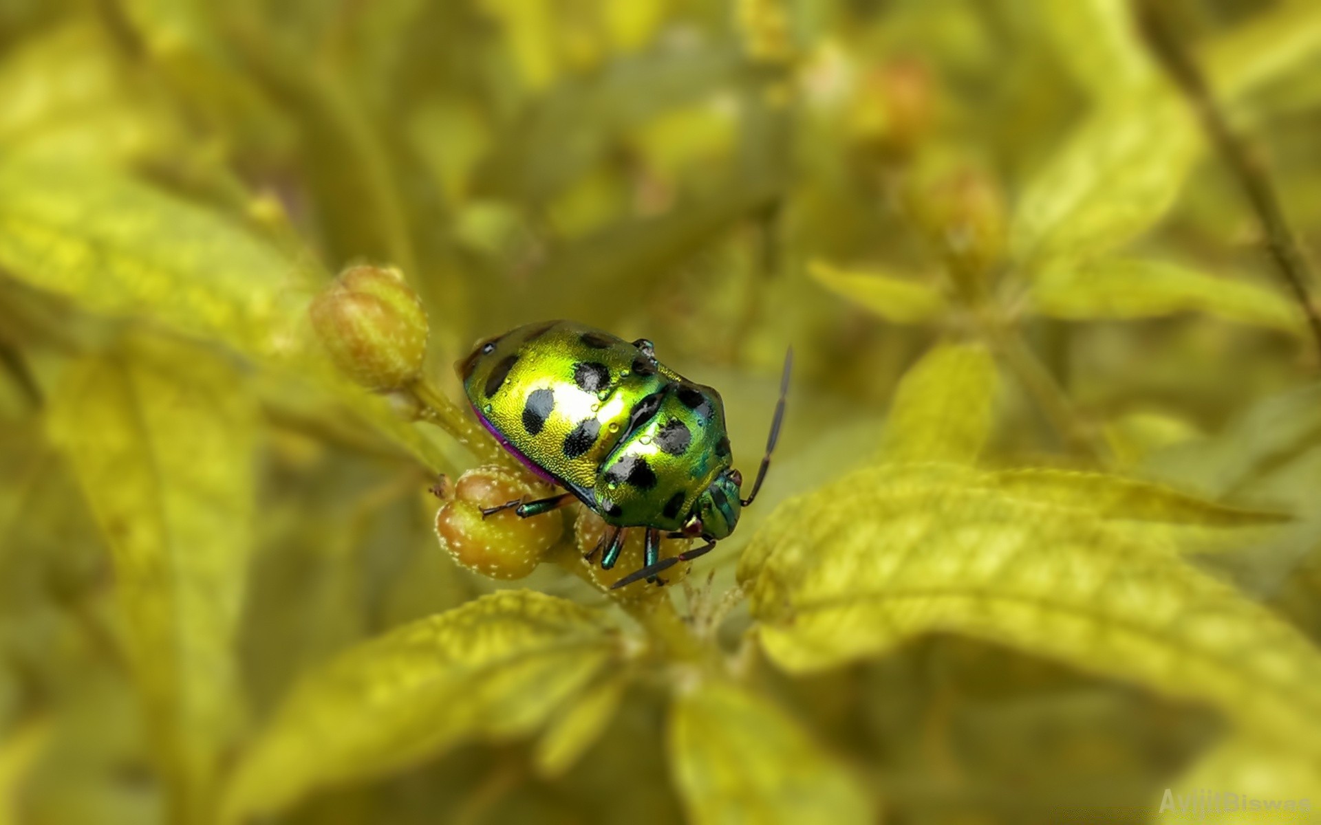 A green beetle with black dots on its back