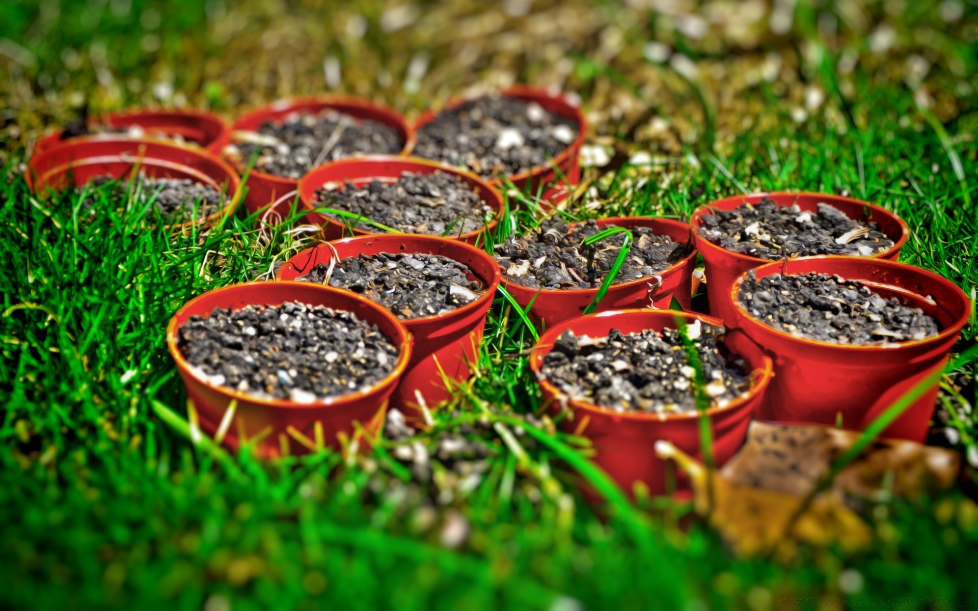 Pots of earth. Juicy grass