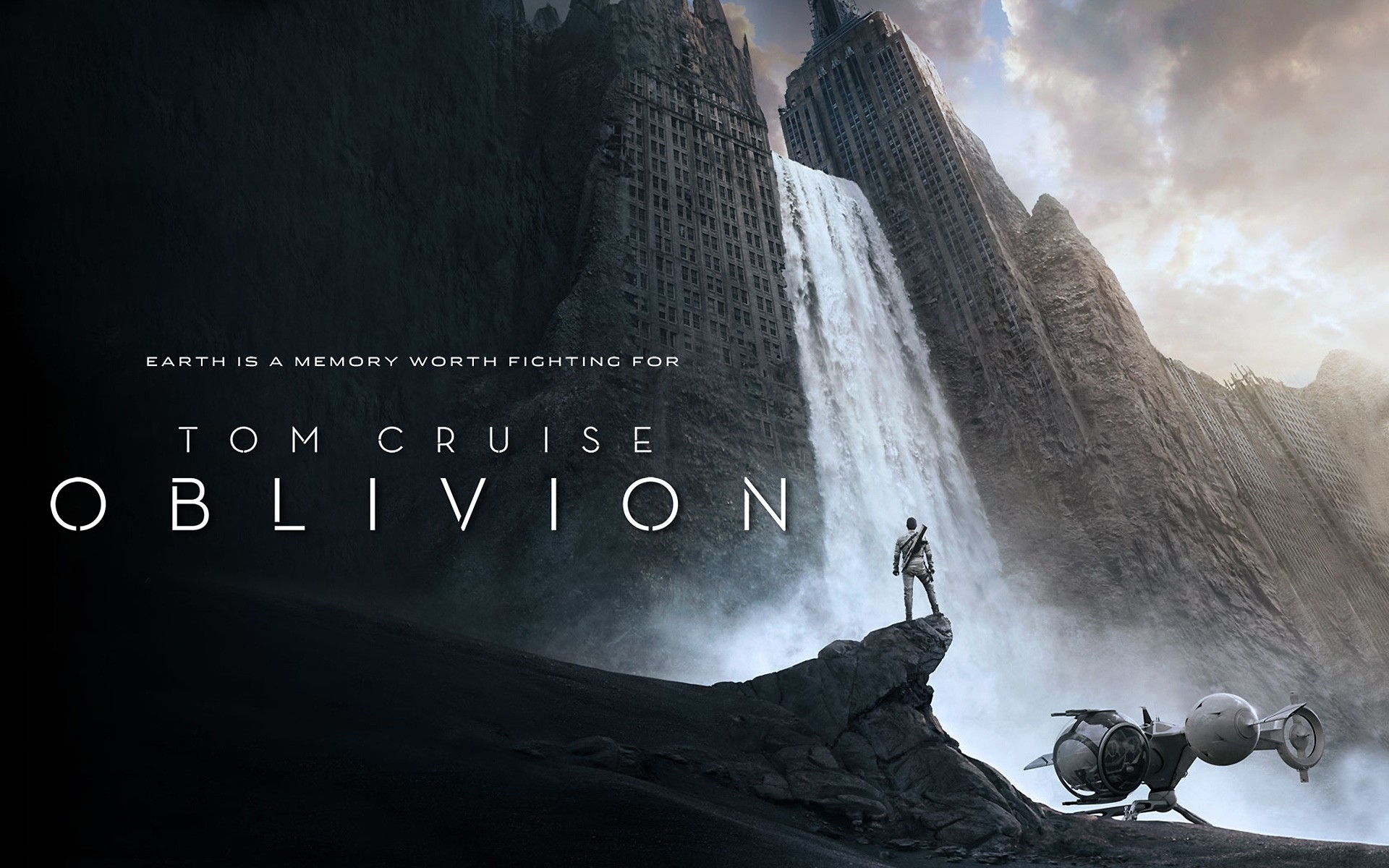 A fantastic waterfall and a man with an aircraft with the Oblivion logo