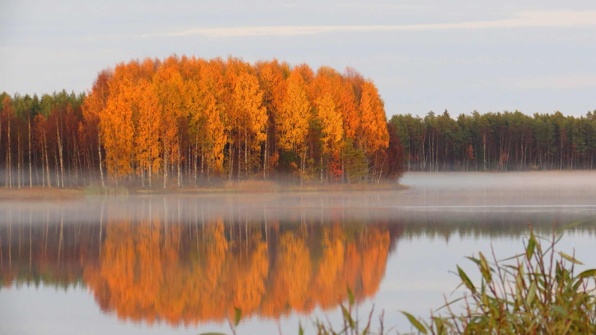 Autumn dawn with trees on the lake