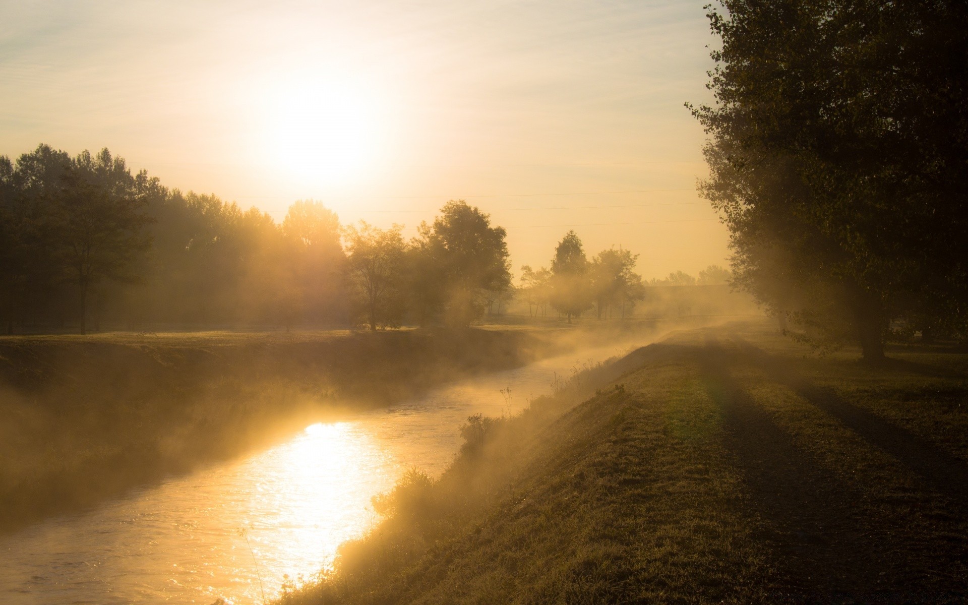 The morning sun is reflected in the lake