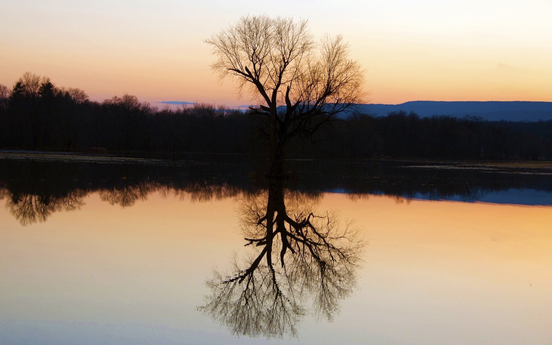 Natural landscape with the reflection of a tree on the water surface