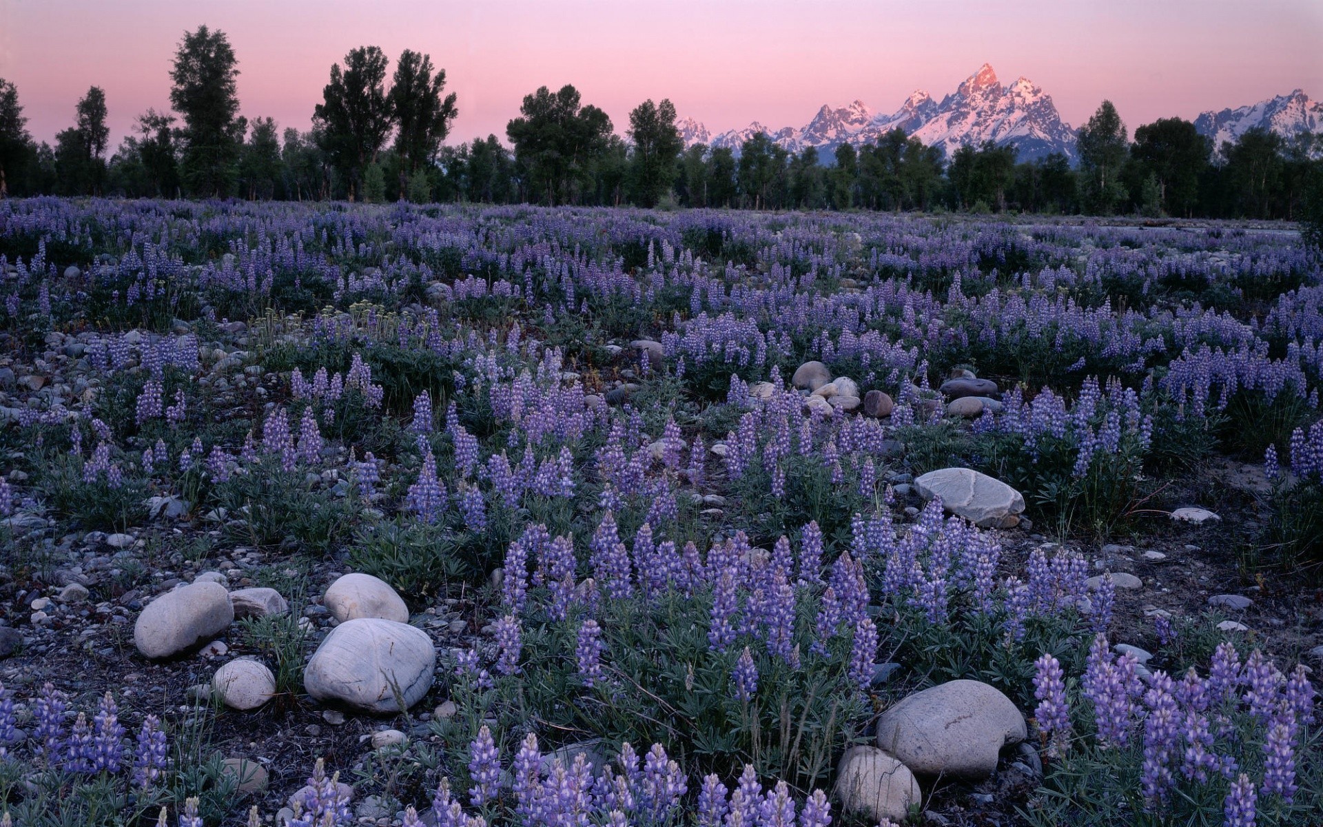 Landscape glade blue flowers stones mountains