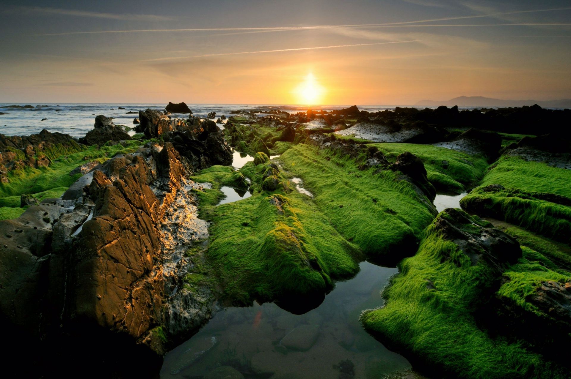 Strikingly bright colors of the landscape with rocks and the sea at sunsetStrikingly bright colors of the landscape with rocks and the sea at sunset