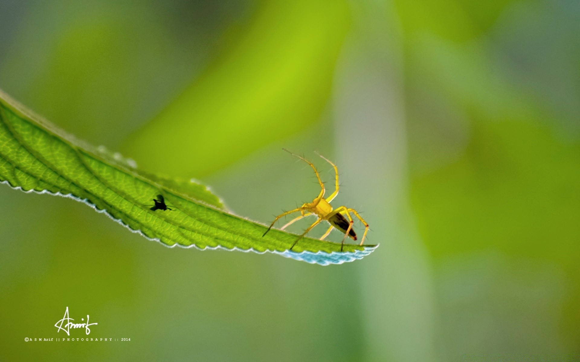 A spider crawls after an insect on a leaf