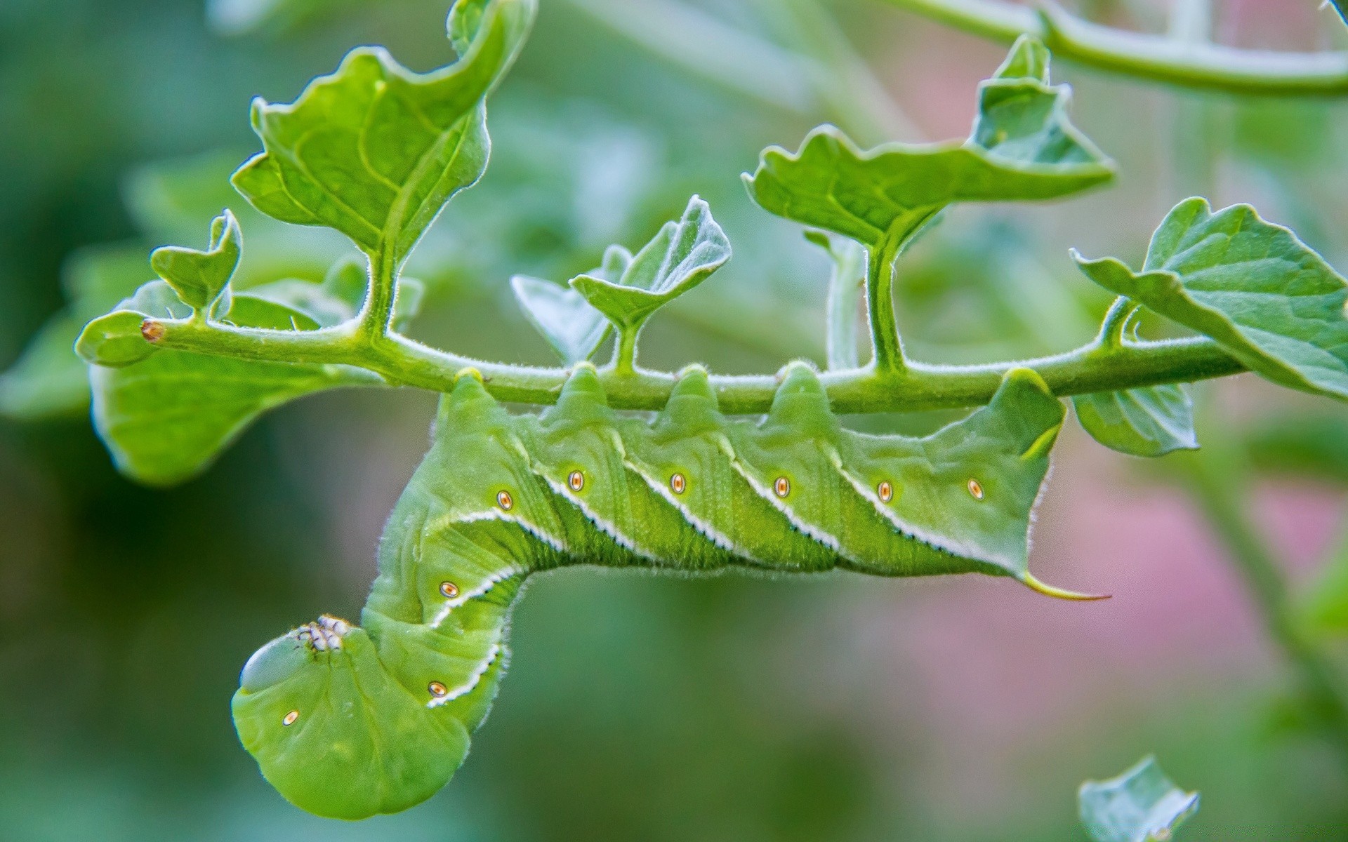 Mimicry of a green caterpillar under a plant leaf