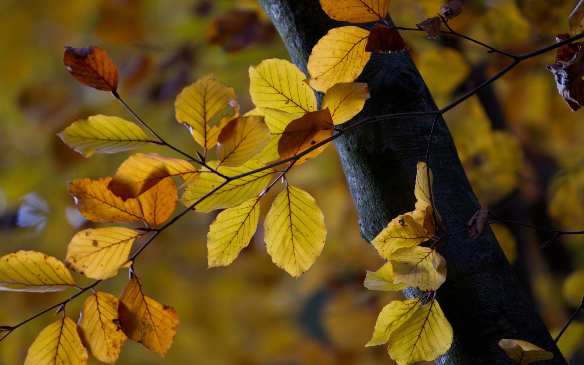 Trunks of white birch trees among yellow leaves, illuminated by the autumn sun