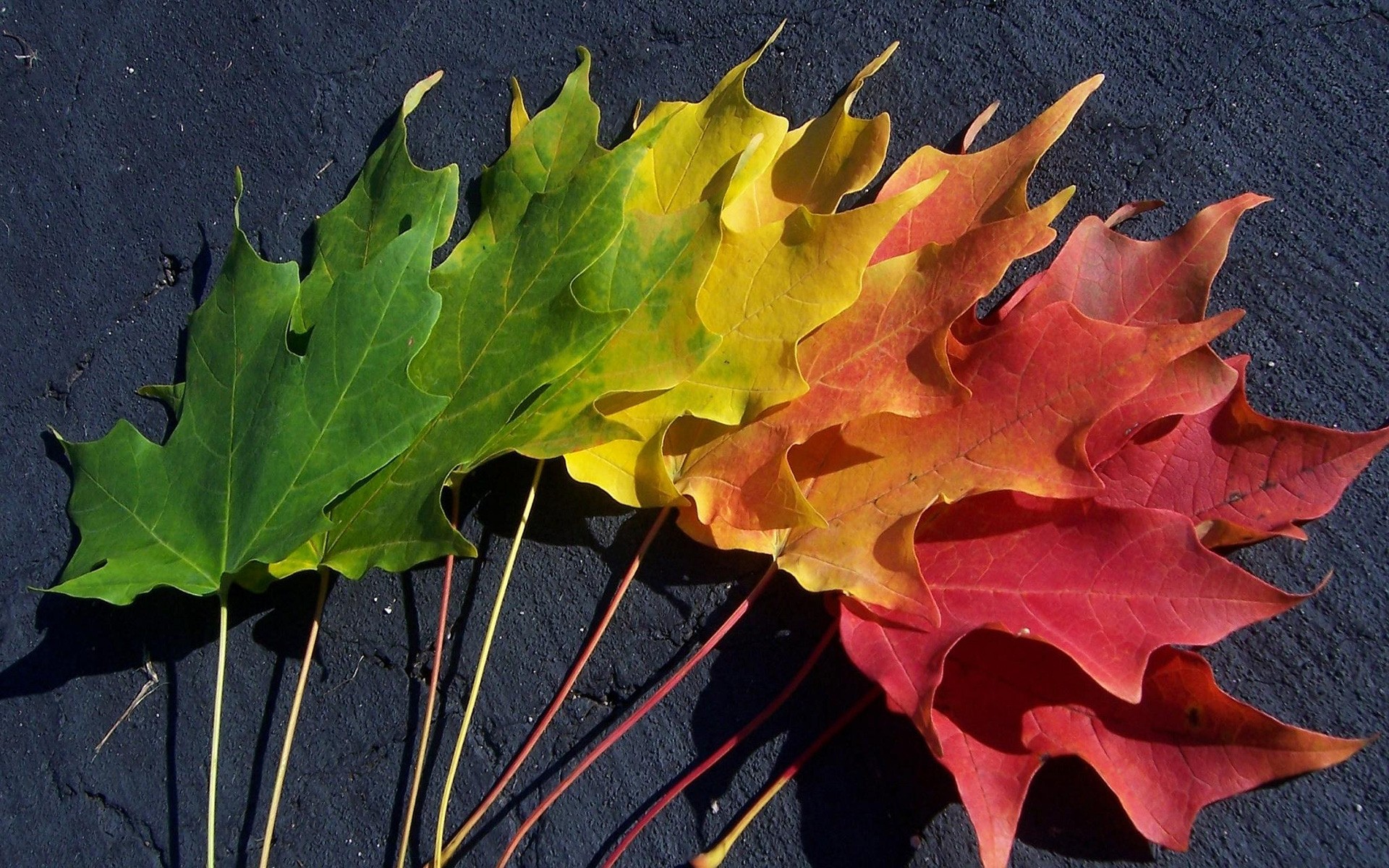 A wooden bench stands in an autumn forest among fallen yellow leaves