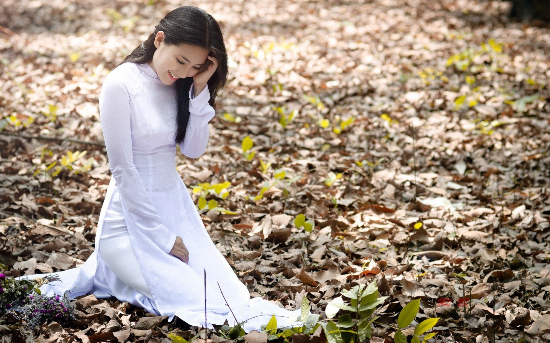 A girl in white is sitting on autumn leaves