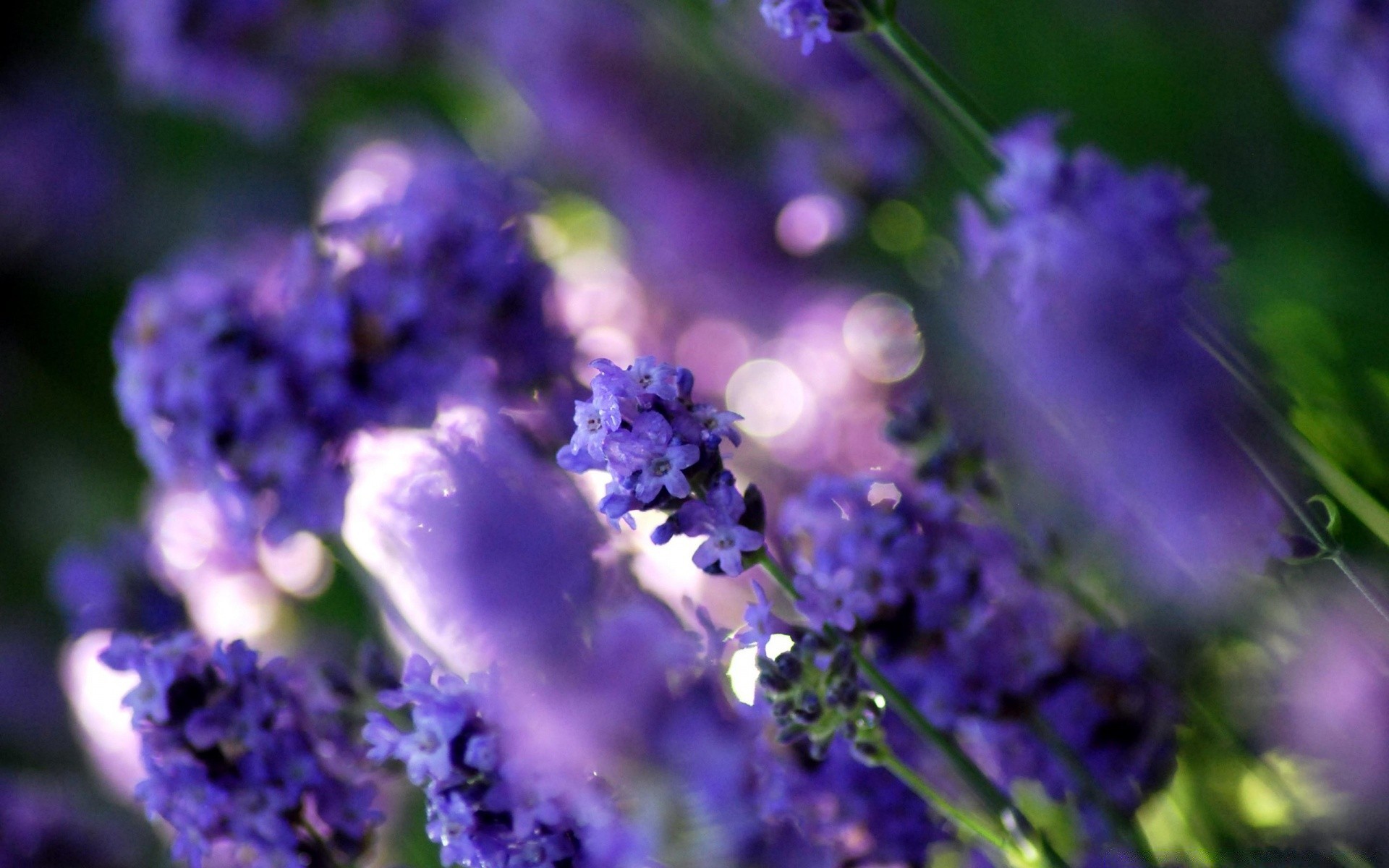 Two blurred lilac balls merge into one big blurred blue ball on a dark background