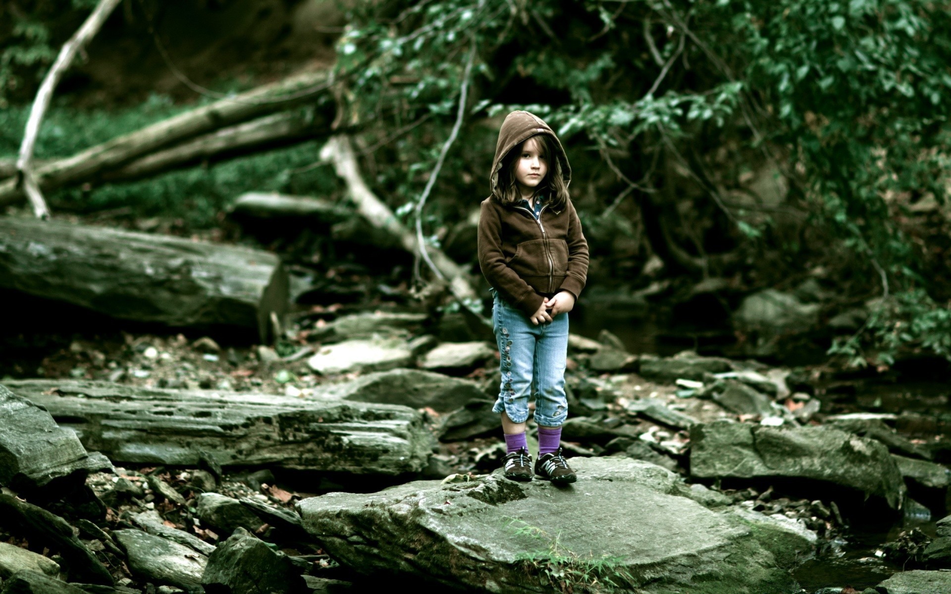 The child stands in the forest and looks into the distanceThe child stands in the forest and looks into the distance
