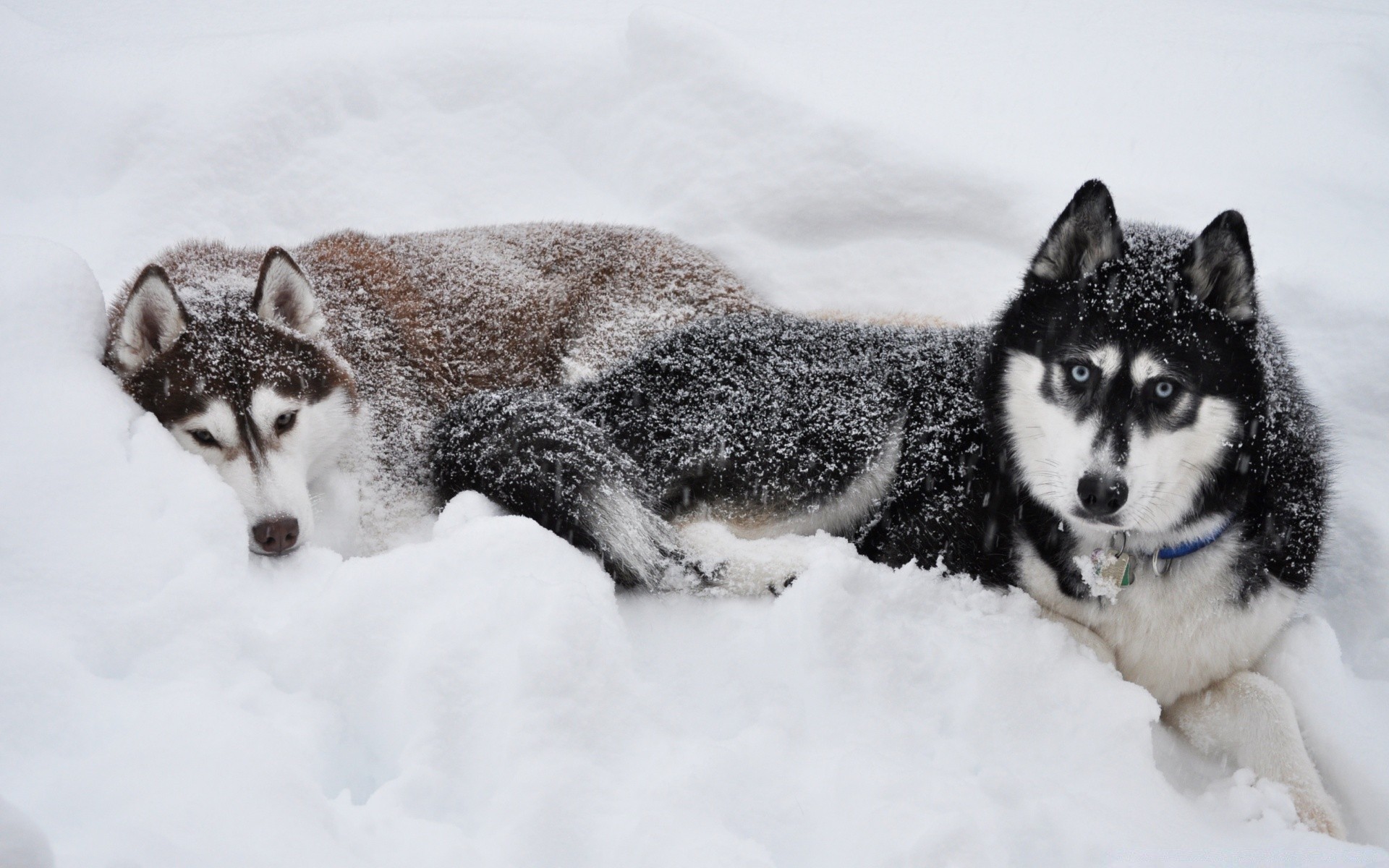 Two huskies are lying in the snow