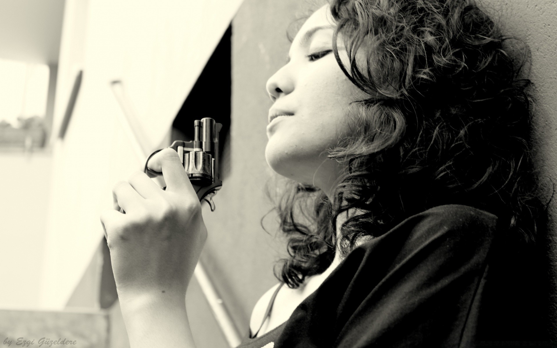 Black and white portrait of a girl with a gun