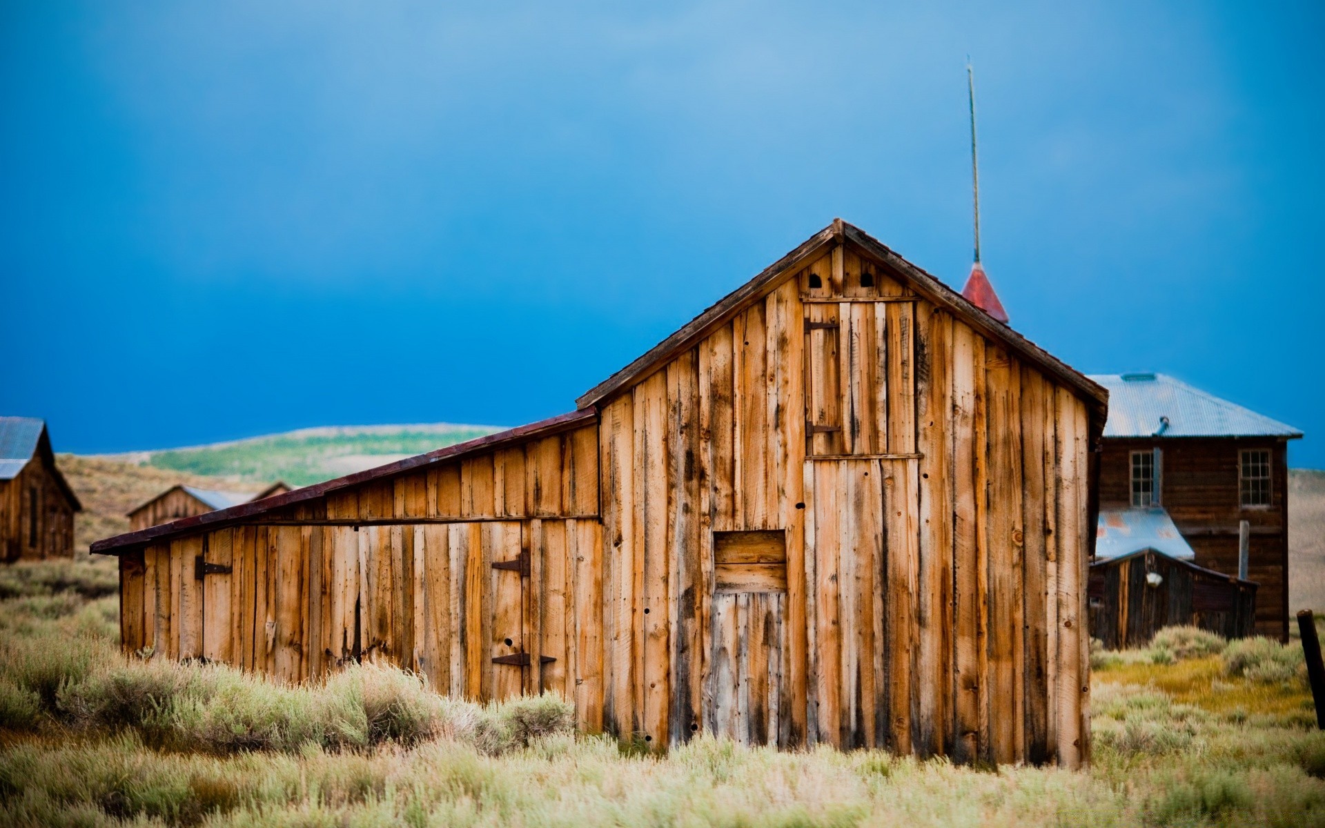 Wooden shed on a green field