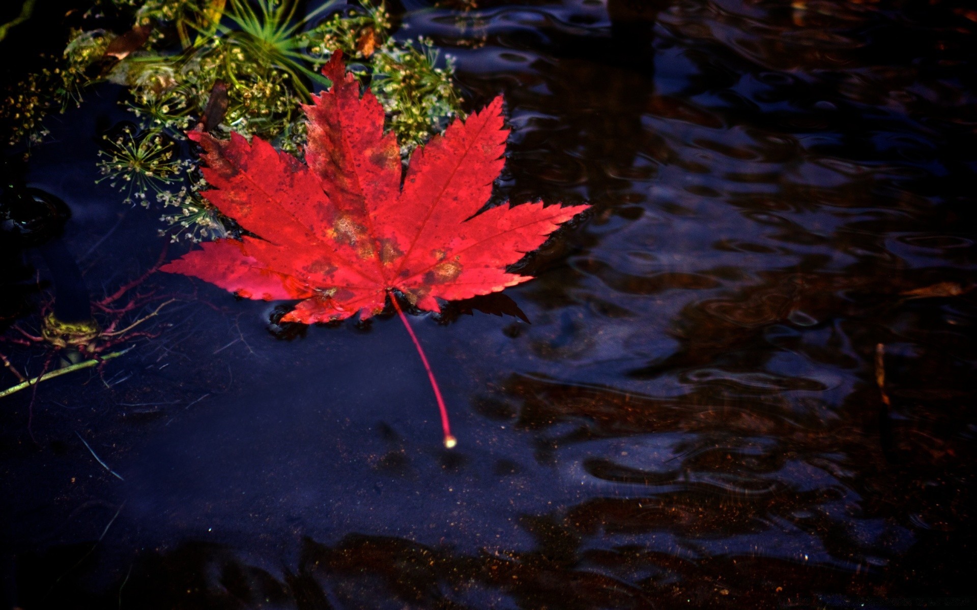 A red maple leaf fell into the water