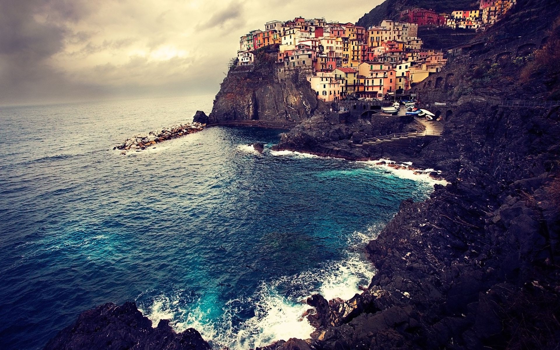 Large boulders in the sand go into the sea water at a yellow-red sunset