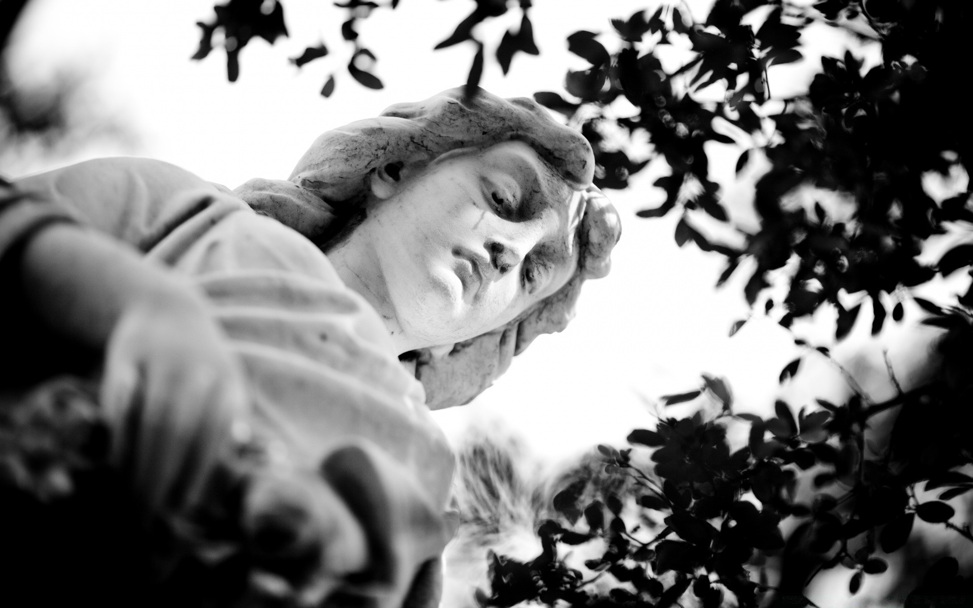 Monochrome photo of the sculpture from below