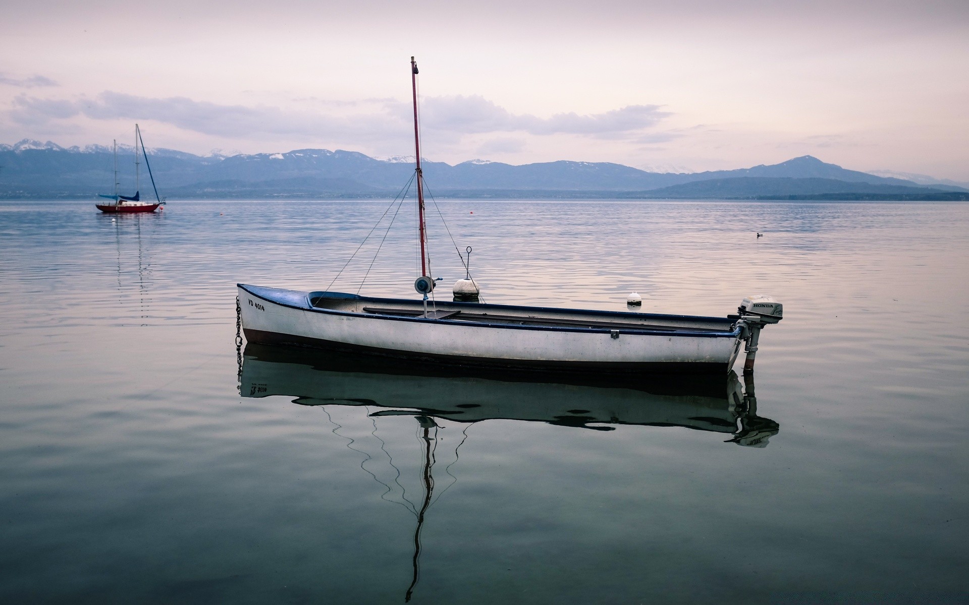 Calm and sailboat. Foggy morning
