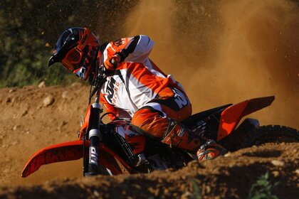 The participant of the motorcycle race easily overcomes the trackThe participant of the motorcycle race easily overcomes the track