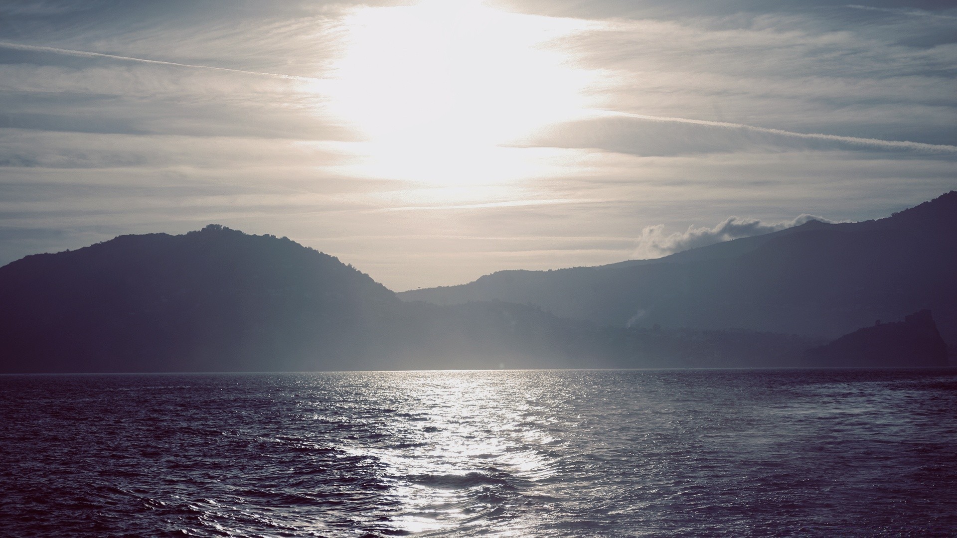 Pink sunset. Pink clouds over the lake. Mountains. Twilight