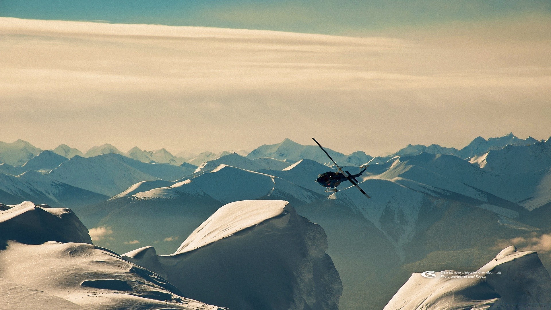 The helicopter is flying among the snowy mountain peaks