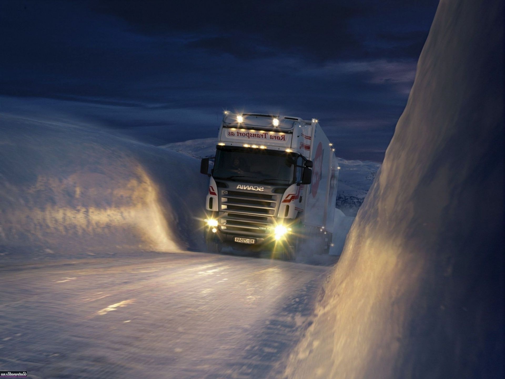 A truck driving uphill on a snowy winter highway at nightA truck driving uphill on a snowy winter highway at night
