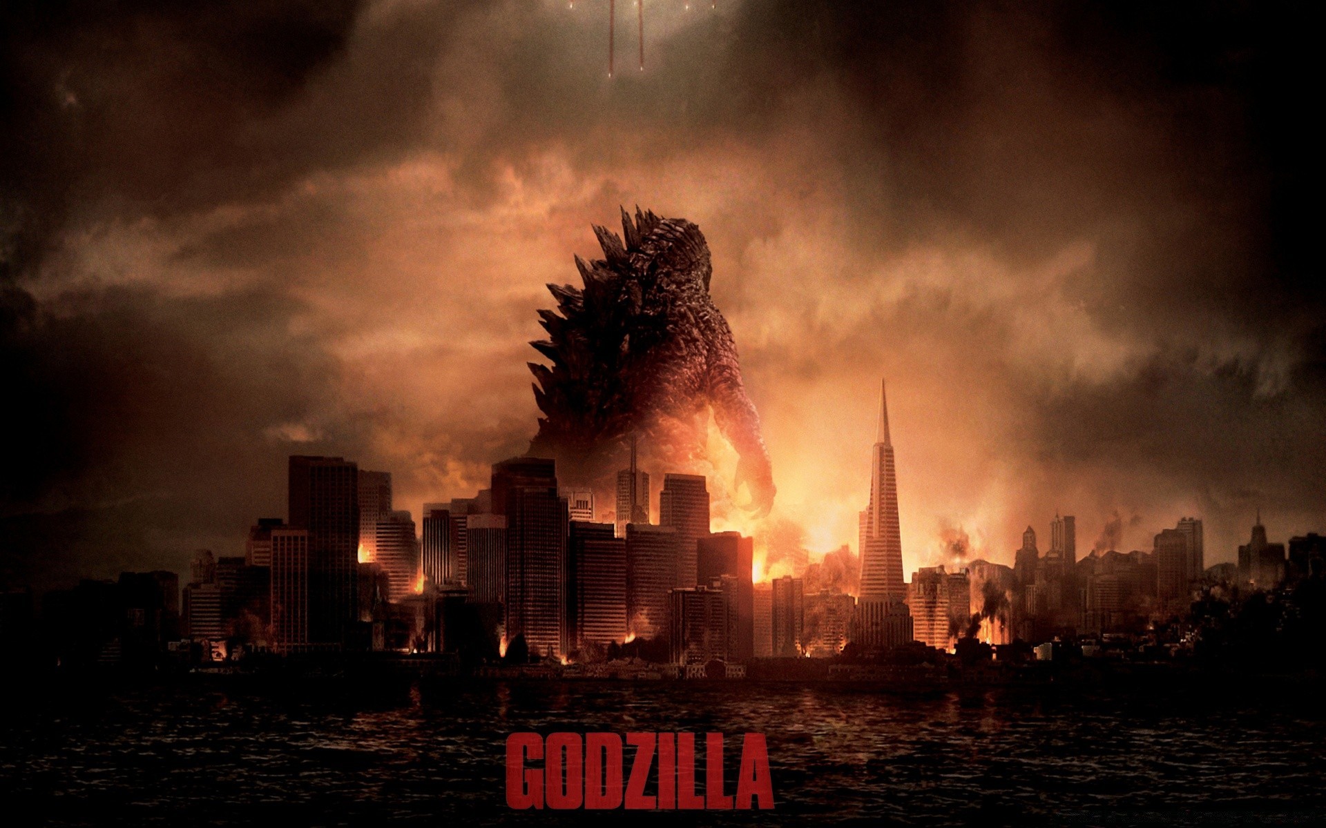 A picture from the movie "Godzilla". Godzilla in the city at sunset