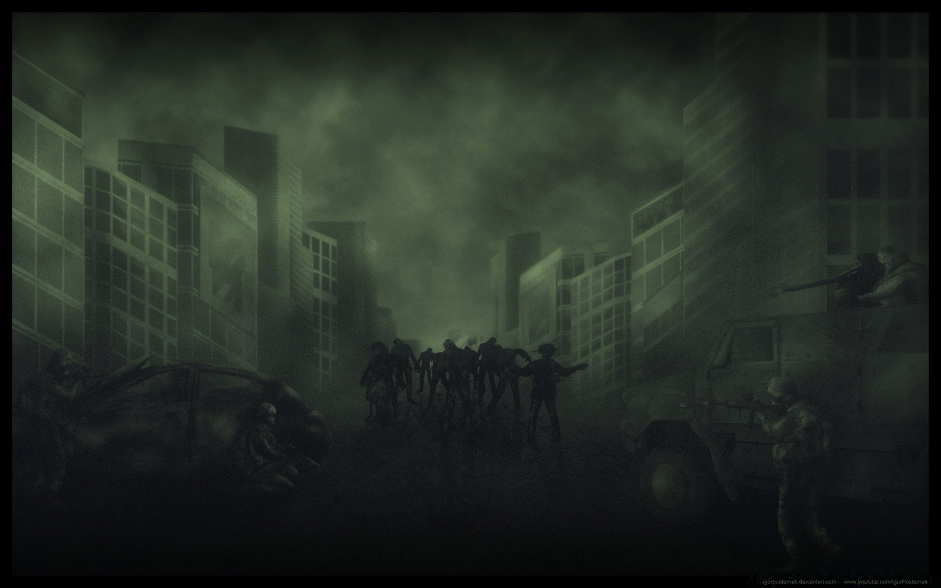 Horror pictures of a city with fog and zombies