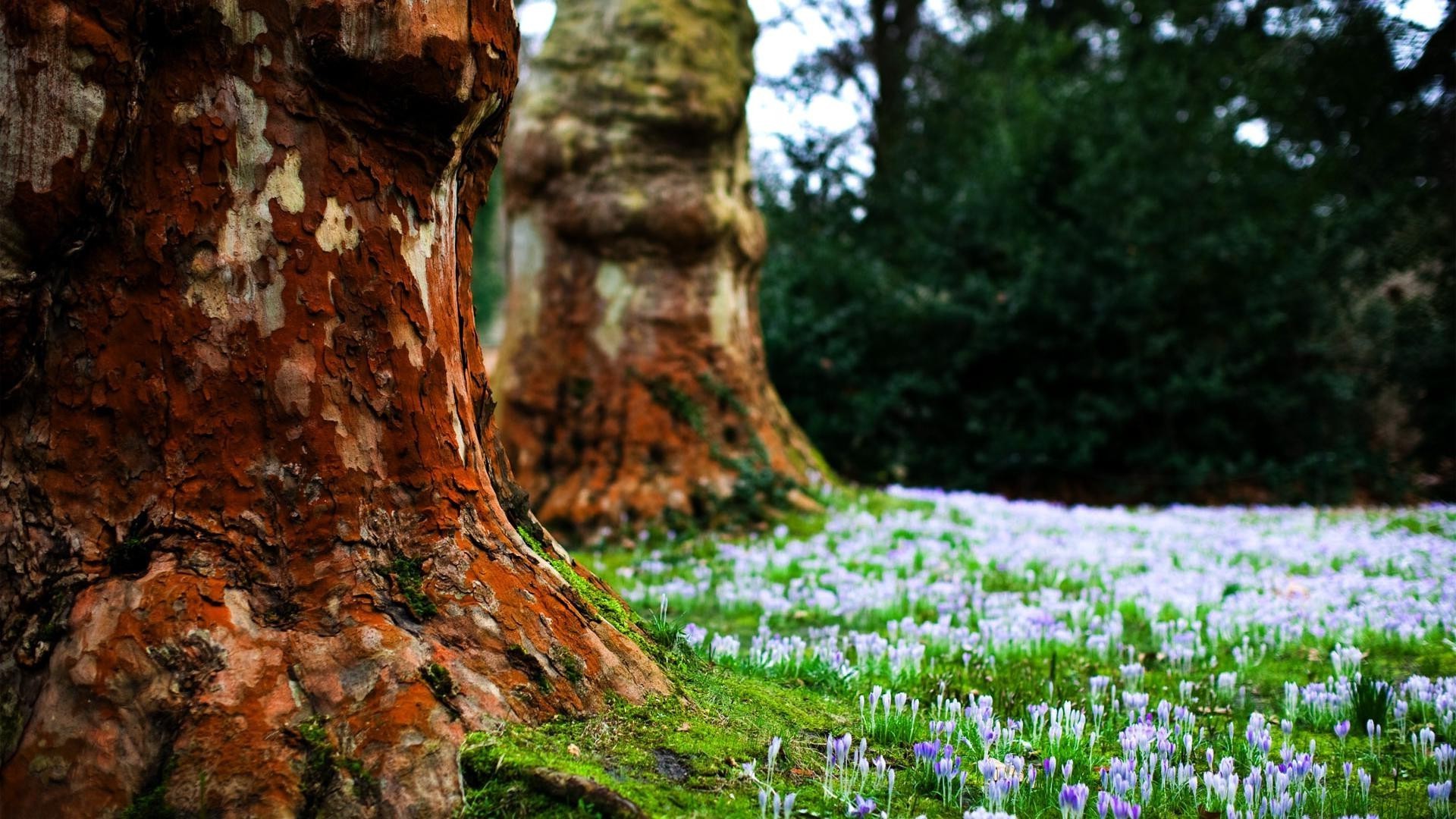 Purple flowers on old tree trunks