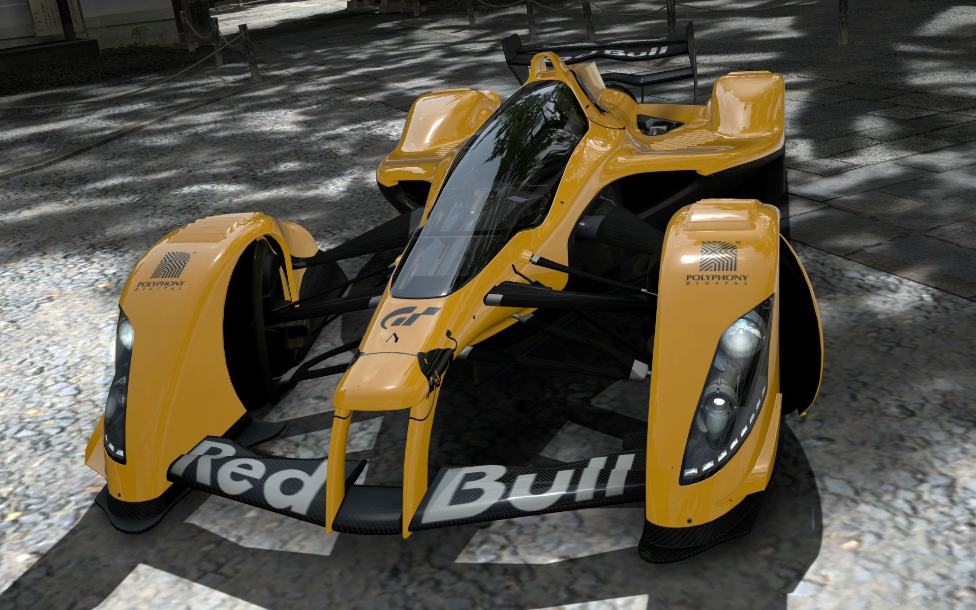 Yellow sports car with energy drink logo
