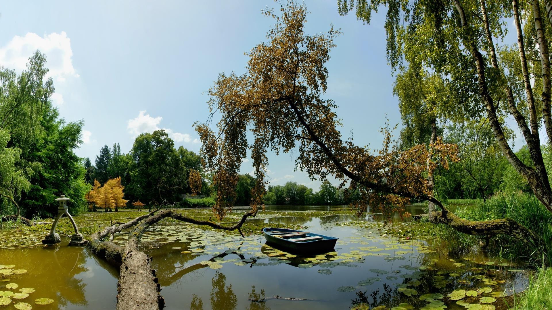 Autumn nature, trees are painted with bright colors, a lake on their background