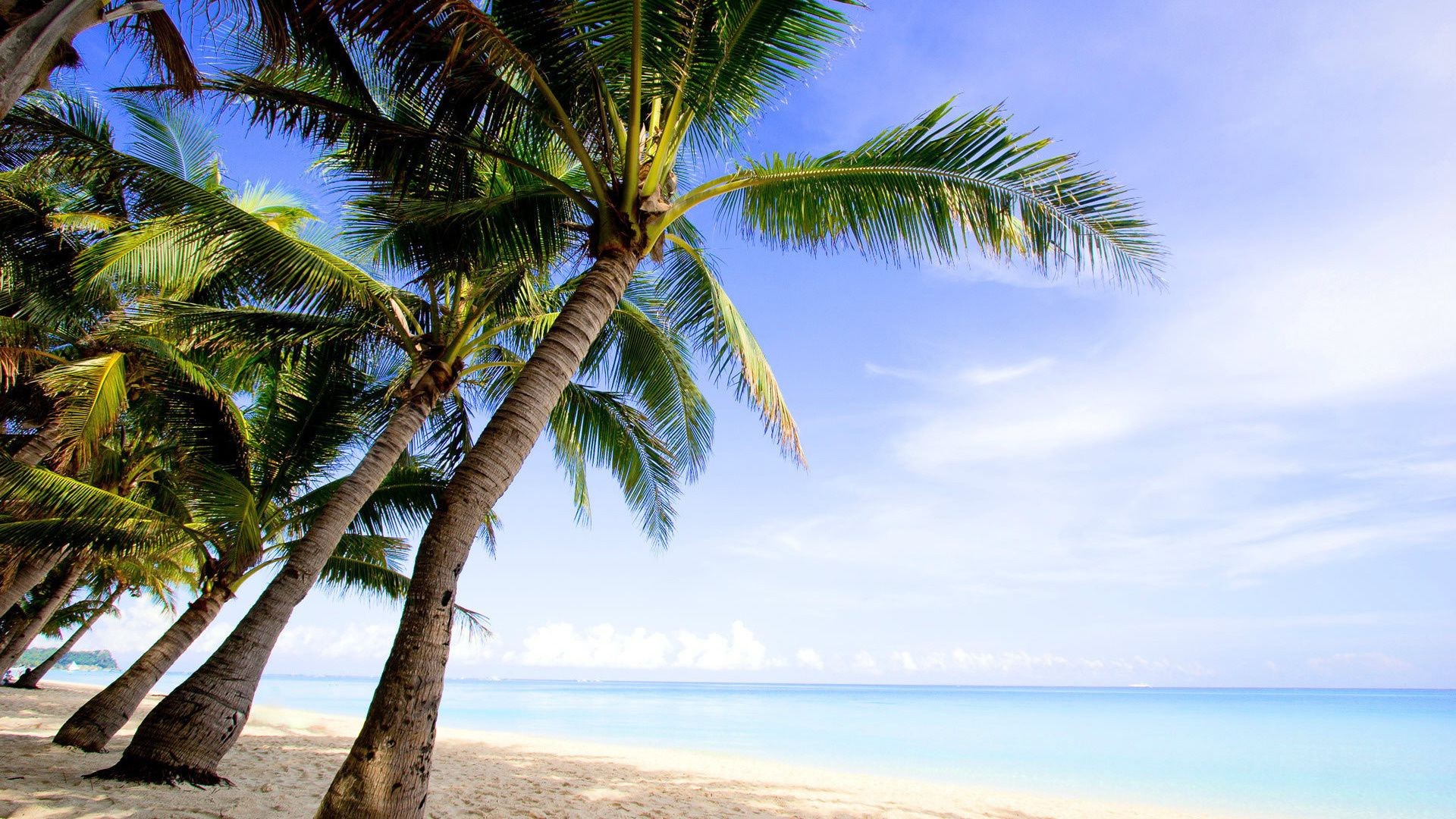 Lots of green palm trees on white sand