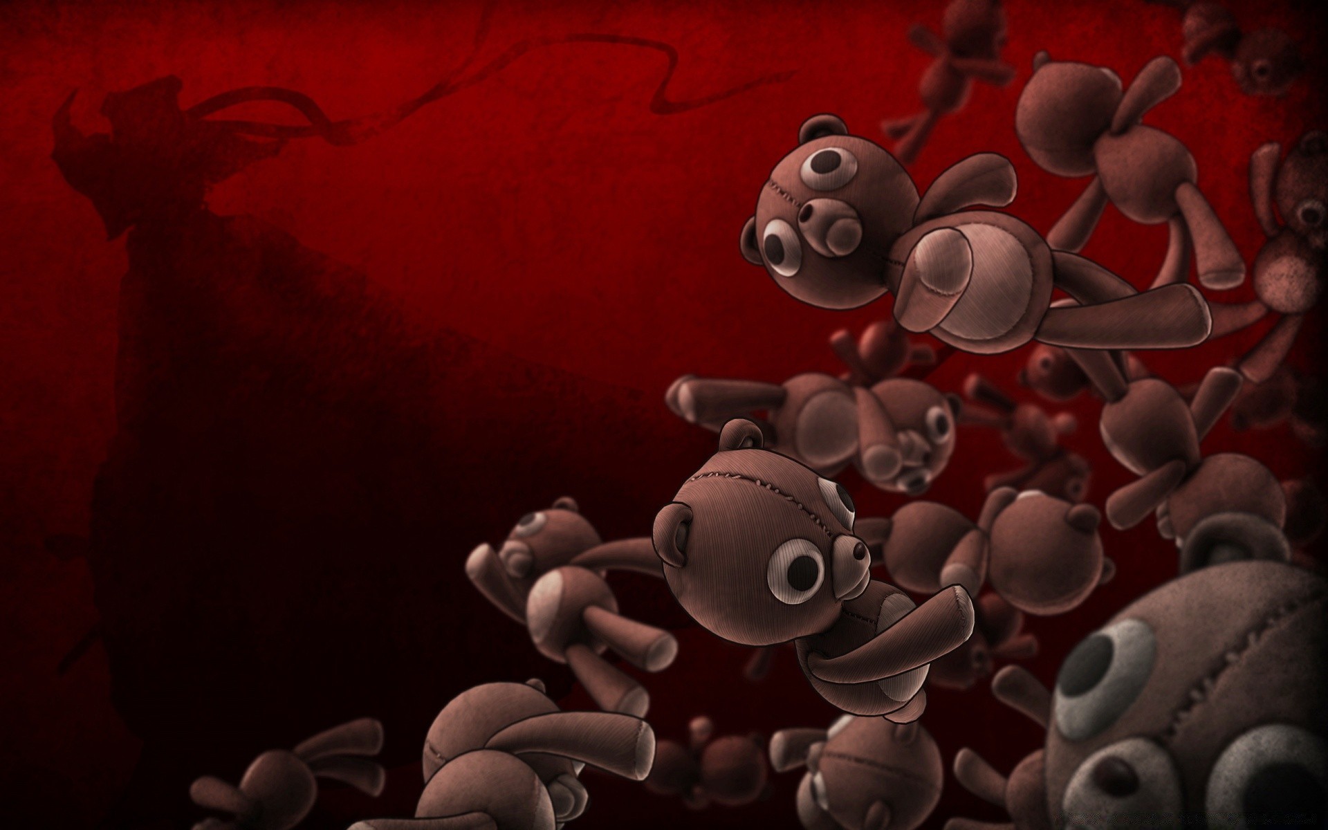 Lots of toy bears on a red background