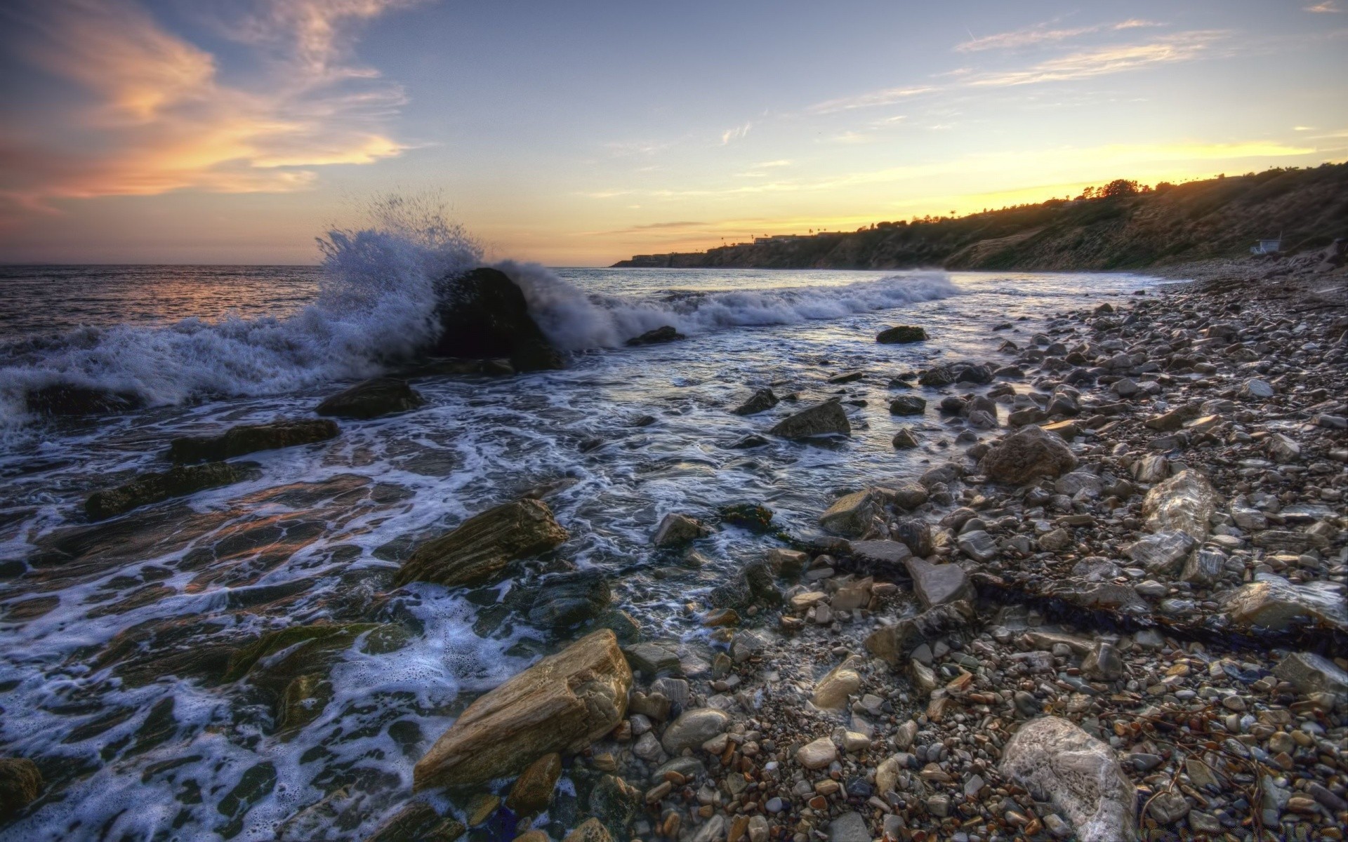 Pebble beach on the sea at sunset