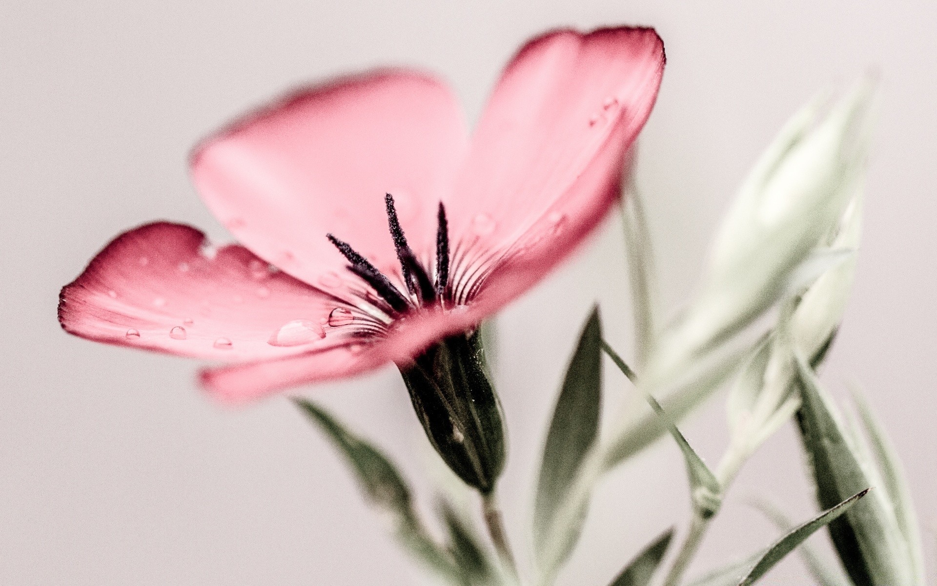 Delicate pink flower with dew drops