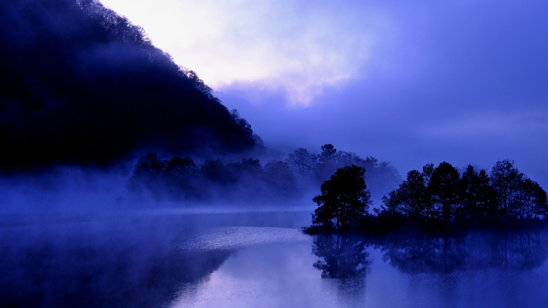 Fog over the reservoir near the mountains in blue shades