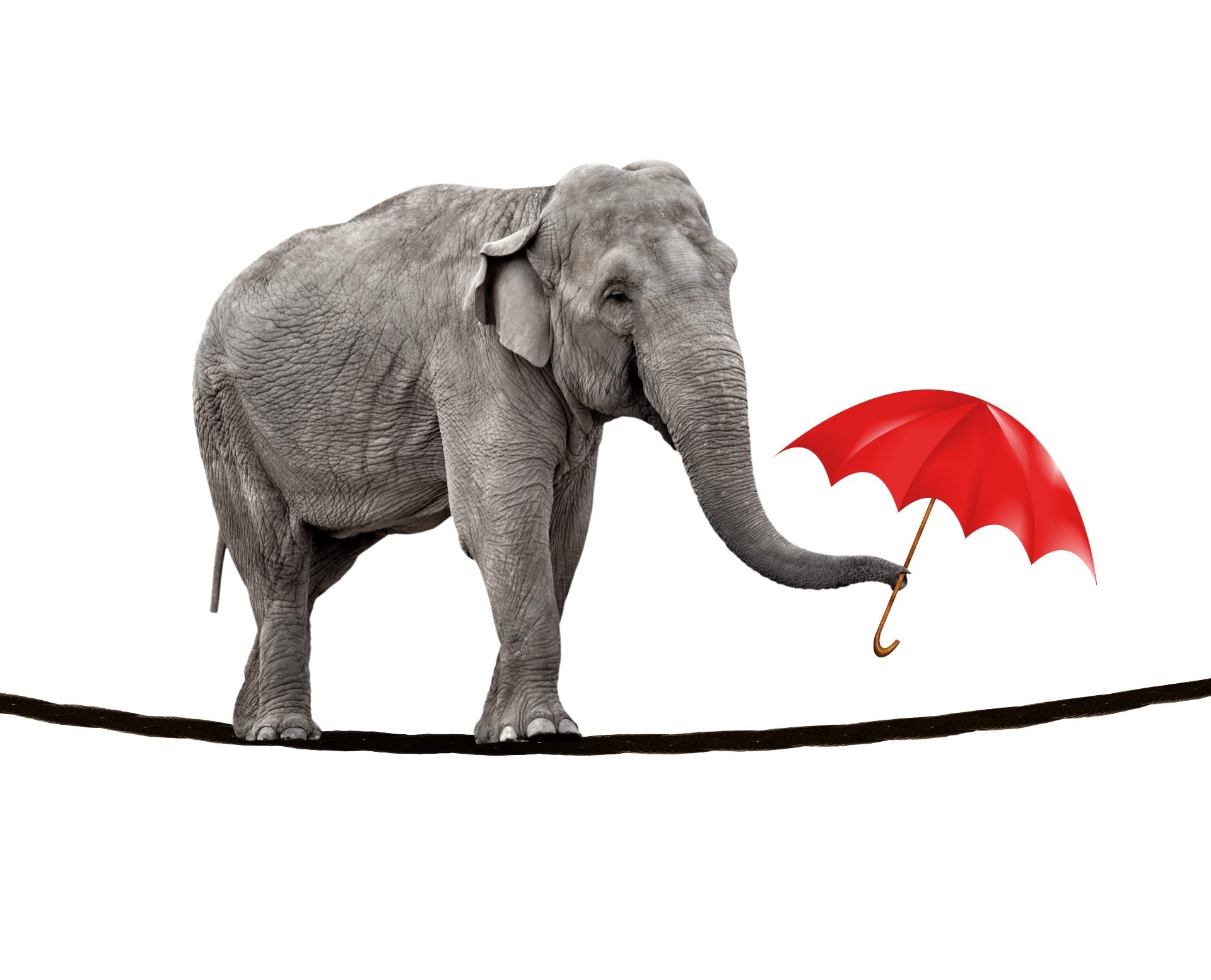 Elephant on a rope with a red umbrella