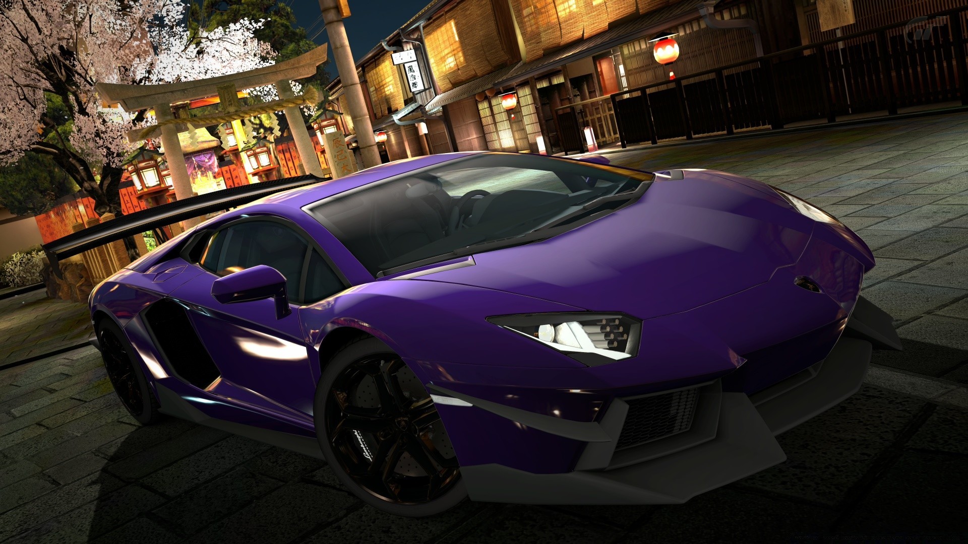 Purple car, sakura, pagoda and Chinese lanterns