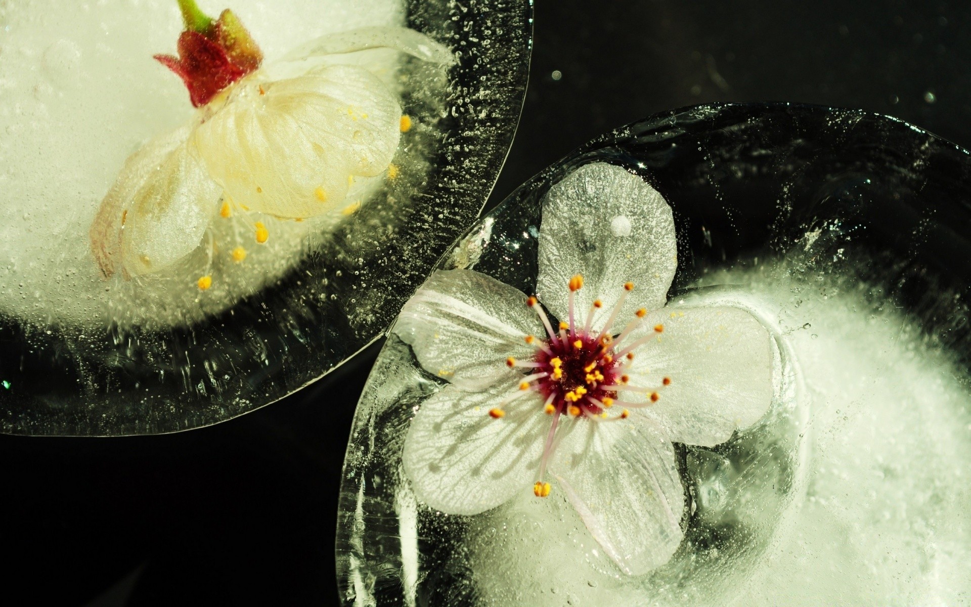 A picture of two delicate fresh flowers on a wet surfaceA picture of two delicate fresh flowers on a wet surface