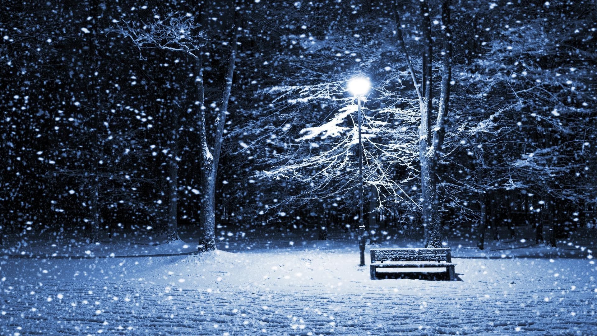 A bench under a lantern on a frosty night